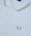 M3600 kleur V27 polo pique Fred Perry Twin Tipped polo lichtblauw met grijs Fred Perry logo en grijze strepen bij de boord en mouwen LIGHTICE/WRMGREY 100 procent katoen
